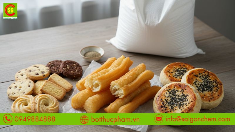 Thích hợp cho nhiều loại bánh, được sử dụng rộng rãi trong: Các loại món ăn cần nở nhanh, rỗng ruột, giòn mặt. Nhờ tính ổn định cao, nguyên liệu này giúp các loại thực phẩm chế biến đạt chuẩn về độ nở, mùi thơm, màu sắc.